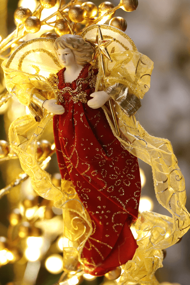 Ángel para colgar en el árbol, rostro en poliresina y vestido en encolado– Color Rojo