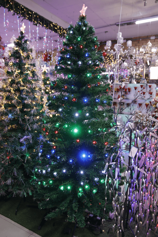 Árbol decorativo con iluminación LED y fibra óptica en tonos multicolor, adornado con estrellas brillantes. Su efecto luminoso dinámico crea un ambiente festivo y llamativo, ideal para resaltar cualquier espacio durante la temporada navideña.