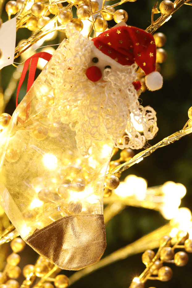 Bota decorativa transparente con figura de Noel, diseñada para colgar en el árbol. Un adorno original que combina tradición y un toque moderno en la decoración navideña.