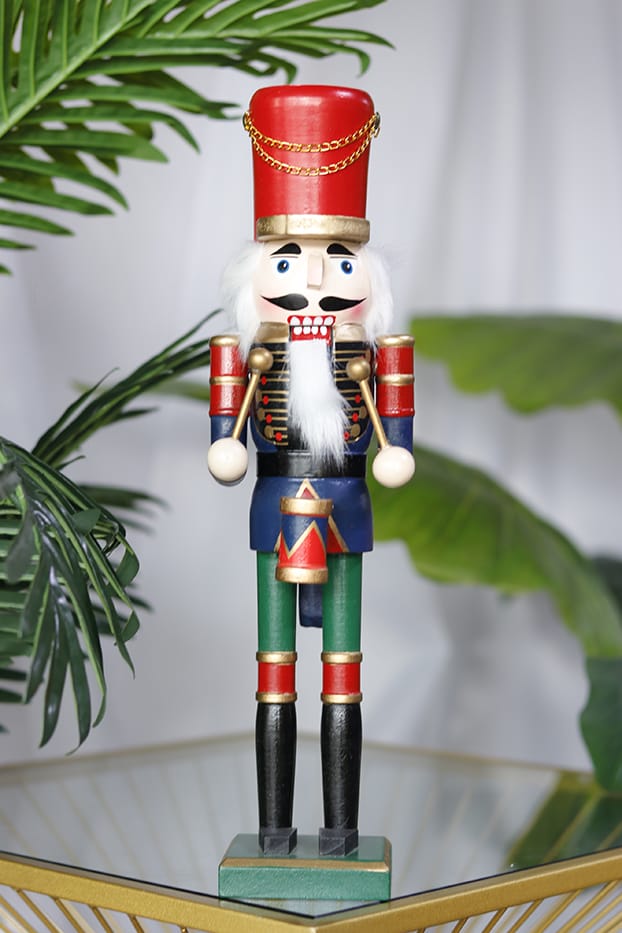 Cascanueces de 38cm con tambor en madera, sobrero rojo con aplique en cadena y base cuadrada – Color Azul y Verde