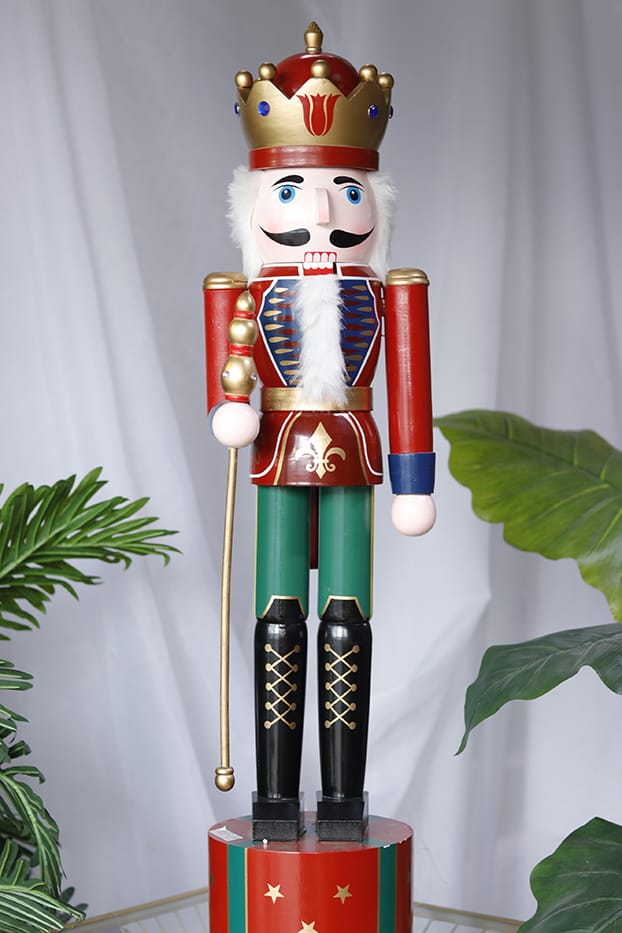 Cascanueces de 90cm en madera pintado, corona con apliques en gemas y cetro.