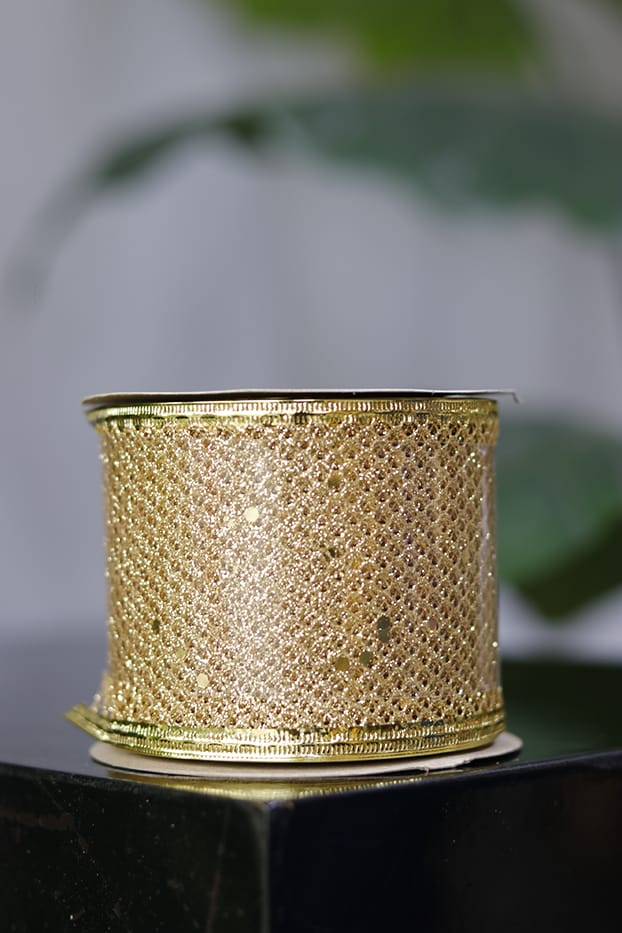 Cinta decorativa de 10 yardas en malla color dorado, con detalles de lentejuelas y escarcha. Borde alambrado en tono a juego para dar forma con facilidad. Ideal para decoraciones brillantes y modernas.