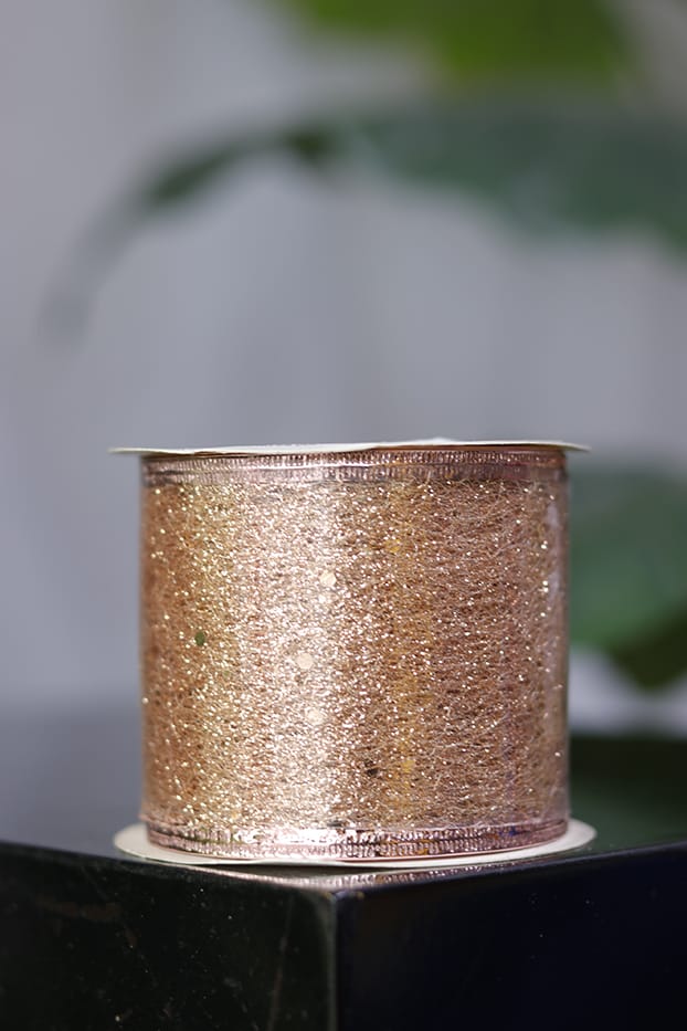 Cinta decorativa de 10 yardas en tono palo rosa, con delicado diseño de encaje escarchado y borde alambrado rosado. Ideal para moños, arreglos románticos y detalles elegantes.