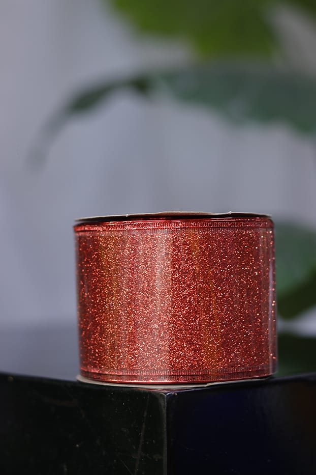 Cinta roja de 10 yardas en poliéster con acabado totalmente escarchado y borde alambrado en el mismo color. Ideal para moños estructurados, arreglos navideños y decoraciones que brillen con estilo.