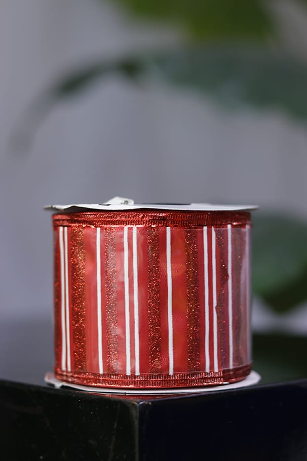 Cinta elegante de organza con brillo en rojo y detalles blancos. Ideal para decorar regalos, arreglos y proyectos creativos.