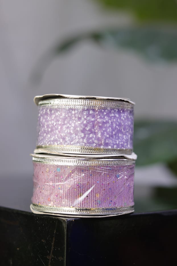 Cinta navideña de 10 yardas en organza semitransparente con diseño de puntos escarchados. En fucsia y lila. Ideal para moños, envolturas y decoraciones que necesitan un toque elegante y luminoso.