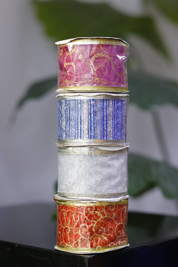 Cinta decorativa de 10 yardas en organza semitransparente color fucsia con delicadas figuras escarchadas en dorado. Perfecta para moños, arreglos florales y decoración navideña con un toque glam.