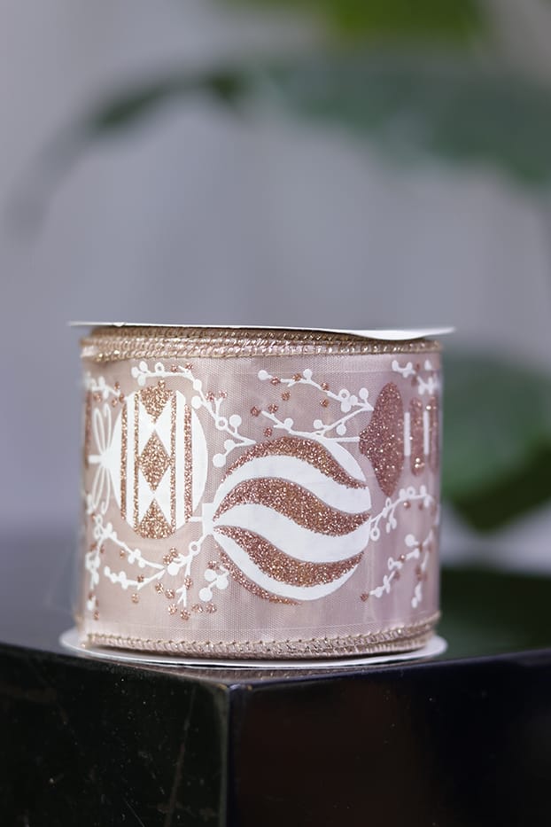 Cinta de jacquard con borde alambrado y diseño festivo de globos en escarcha oro rosa con delicadas ramas blancas. Ideal para dar un toque brillante y elegante a tus decoraciones y regalos.