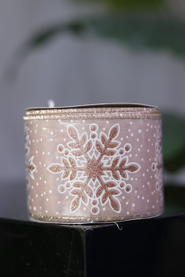 Cinta alambrada de jacquard en tono palo rosa con copos decorados en escarcha y puntos blancos. Perfecta para dar un toque elegante y festivo a tus arreglos, regalos y decoraciones.