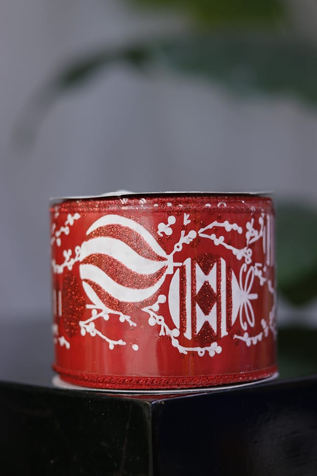 Cinta de jacquard con borde alambrado y diseño festivo de globos en escarcha roja con delicadas ramas blancas. Ideal para dar un toque brillante y elegante a tus decoraciones y regalos.