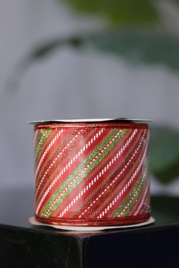 Cinta roja alambrada con diseño de rayas diagonales en tonos rojo y verde escarchado y blanco. Ideal para lazos, arreglos y decoraciones con un toque moderno y brillante.