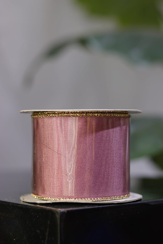 Cinta de tela satín con acabado brillante en tono morado oscuro. Su borde reforzado con hilo dorado le da un toque elegante y mantiene la forma al decorar.