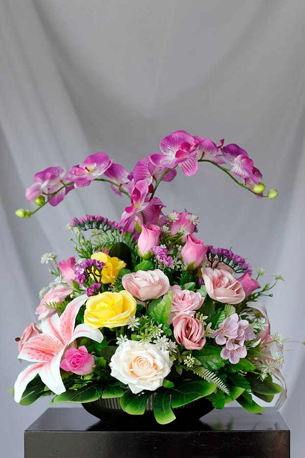 Arreglo con orquídea morada, rosas rosadas, amarillas, lilas, follaje blanco y morado, helecho cuero verde, hoja balazo con base plástica.