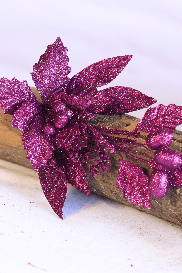 Pick de poinsettia escarchada con follaje, hojas y detalles en pepas.