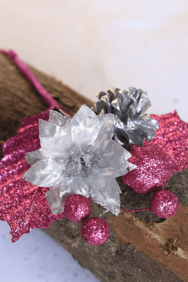 Pick de poinsettia con piña y hojas escarchadas.