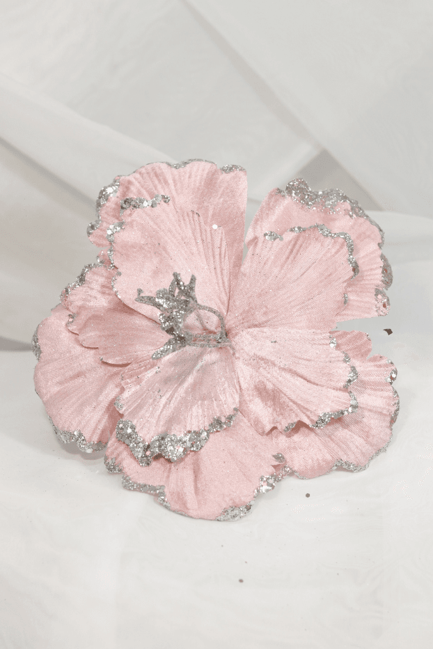 Poinsettia por 10 pétalos en tela gamuzada con bordes escarchados en color plata, en el centro con follaje escarchado