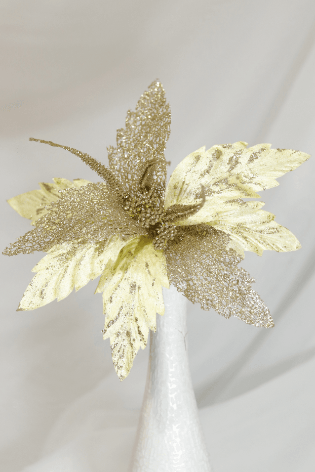 Poinsettia por 8 pétalos, pétalos en tela gamuzada y pétalos tela en encaje, en el centro con follaje en forma de espiral azul escarchado – Color Amarillo