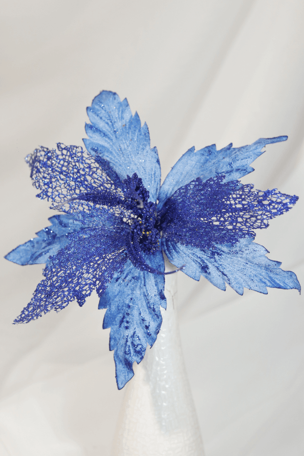 Poinsettia por 8 pétalos, pétalos en tela gamuzada y pétalos tela en encaje, en el centro con follaje en forma de espiral azul escarchado – Color Azul