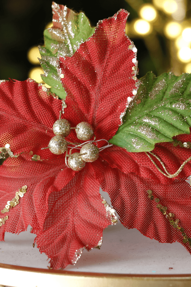 Poinsettia por 8 pétalos, pétalos en tela con aspecto tipo malla con apliques en lentejuelas y pétalos escarchados de color verde, en el centro con bolas de icopor escarchada – Color Rojo y Verde