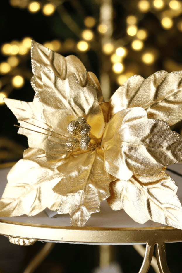 Poinsettia por 9 pétalos en tela satinada brillante en el centro con pepas de icopor escarchados – Color Dorado